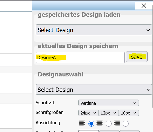 Unter dem Auswahlfeld "gespeichertes Design laden" können Sie nun sofort aus ihren gespeicherten Designs auswählen.