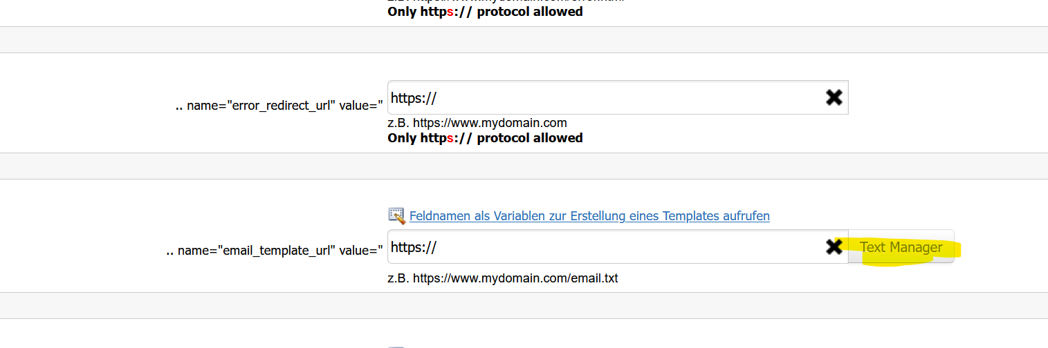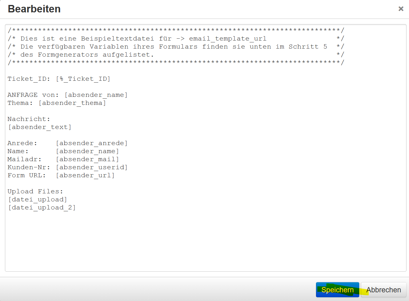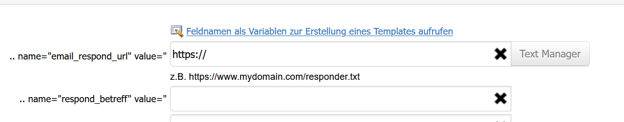 Sie können das benötigte responder Template direkt im Text-Manager speichern und bearbeiten. Auch alle Variablen (Feldnamen) aus dem Formular welche Sie verwenden können finden Sie per Klick auf 'Feldnamen als Variablen zur Erstellung eines Templates aufrufen'