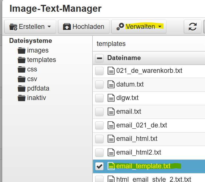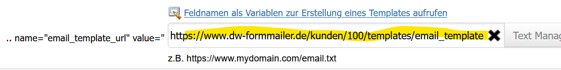 Es schließt der Bearbeitungs Editor. Per Klick auf den Dateinamen, wird nun die URL zum Template automatisch in das Eingabefeld 'email_template_url' übertragen.
