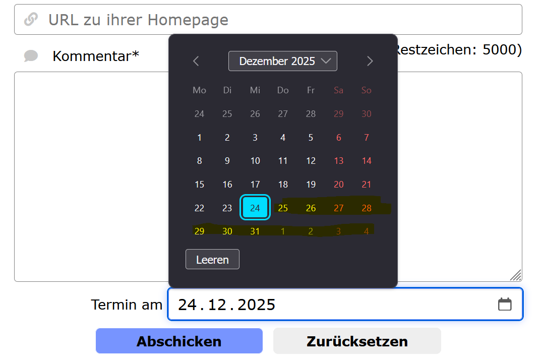 Antwort: Ja. Formgenerator -> Schritt 2 -> beim Datumfeld unter size3 z.B. den Wert z.B. 2025-12-24 eingeben. Dann sind alle späteren Termine ab 25.12.2025 deaktiviert und können nicht ausgewählt werden. In der Grafik sind die Termine ab 25.12.2025 gelb markiert, welche nicht ausgewählt werden können.