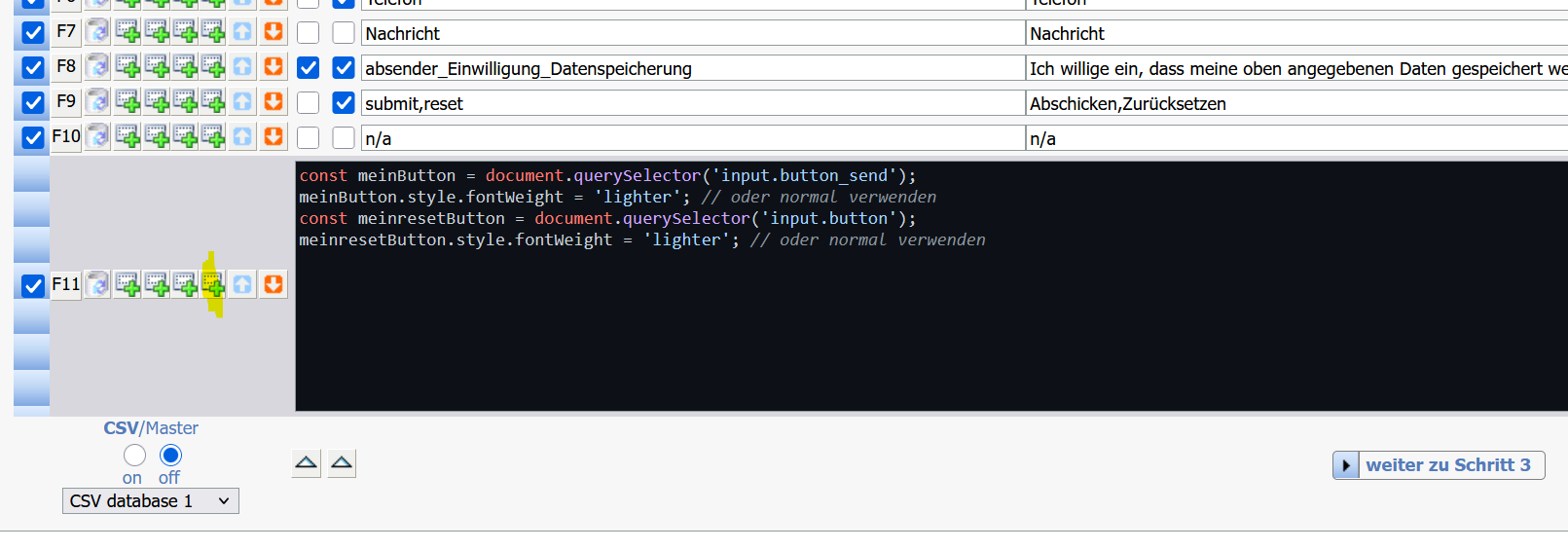 const meinButton = document.querySelector('input.button_send'); meinButton.style.fontWeight = 'lighter'; // oder normal verwenden const meinresetButton = document.querySelector('input.button'); meinresetButton.style.fontWeight = 'lighter'; // oder normal verwenden