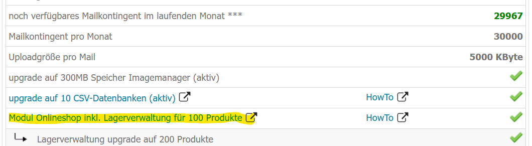 Nach dem Login klicken Sie auf den Link -> Modul Onlineshop inkl. Lagerverwaltung für 100 Produkte