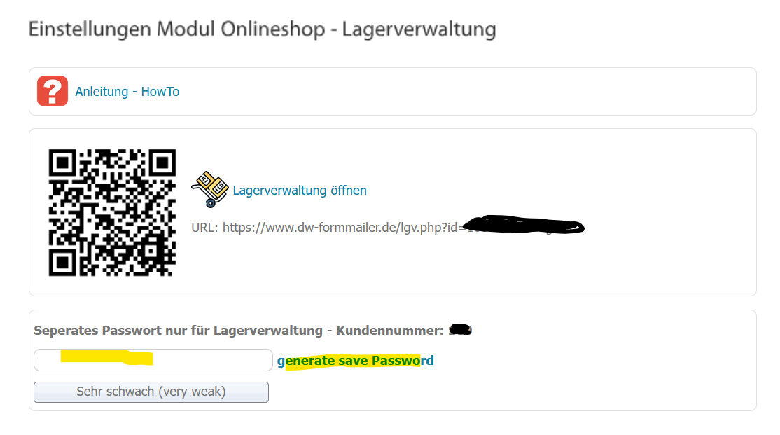 Sie kommen dann zur Einstellungsseite der Lagerverwaltung und können ein Passwort hinterlegen.