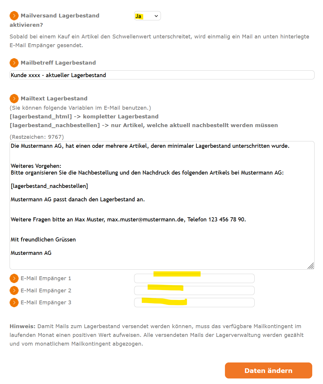 Ebenfalls können Sie auf dieser Seite mit dem Hauptschalter (Mailversand Lagerbestand) auf 'Ja' und der Eingabe mindestens einer korrekter E-Mail Adresse das Programm aktivieren. Den Mail Betreff und den Mailtext können Sie natürlich anpassen. Im Mailtext können Sie alle Variablen wie in jedem Template verwenden. Also nicht nur die Variable [lagerbestand_html] oder [lagerbestand_nachbestellen]. Sie könnten auch mit den ENV Variablen genaue Zeit und Datum im Mailtext übertragen. Z.B.
